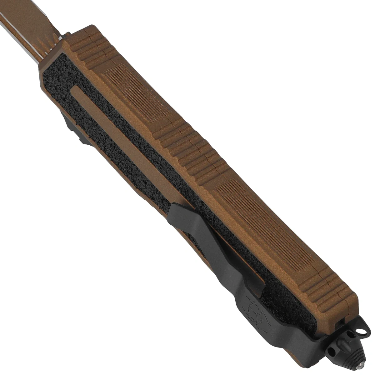 Rękojeść - wykonana z doskonałą precyzją w technologii 3D na frezarkach CNC, z pokrytego powłoką Cerakote™ Burnt Bronze aluminium 6061-T6. Na grzbiecie i dole rękojeści znajdują się nacięcia (jimping) dla pewniejszego chwytu. Smukły profil oraz frezowany dwupozycyjny (prawa/lewa) masywny klips typu deep carry, umożliwiają dyskretne przenoszenie noża w kieszeni, w pozycji tip-down (czubkiem ostrza do dołu). Na klipsie znajduje się charakterystyczny dla tej linii piktogram skarabeusza. Rękojeść zakończono zbijakiem do bicia szyb, masywny stalowy trójkąt, w który wprasowano kulkę z węglika wolframu. Znajduję się w nim również otwór do przeplecenia linki ozdobnej.