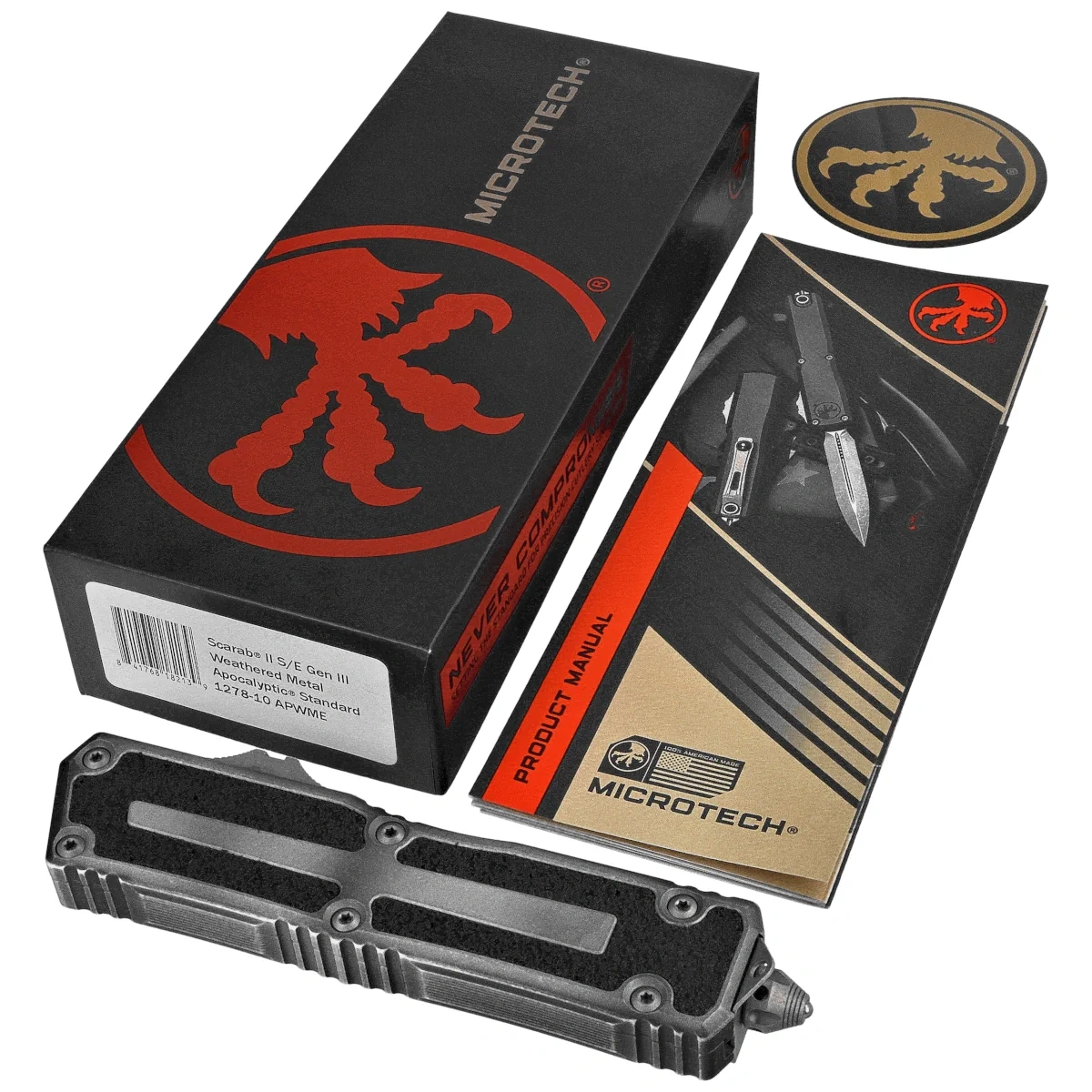 Scarab II Gen III S/E Weathered Metal Aluminium, Apocalyptic to szczyt doskonałości w dziedzinie automatycznych noży taktycznych, czerpiący inspirację z oryginalnego projektu Microtech Ultratech. Zbudowany, aby wytrzymać najtrudniejsze warunki, nowy Scarab II jest najlepszym wyborem do intensywnego użytkowania. Zachowując cechy stylistyczne swojego poprzednika, wyznacza nowy standard dla technologii OTF (Out The Front).