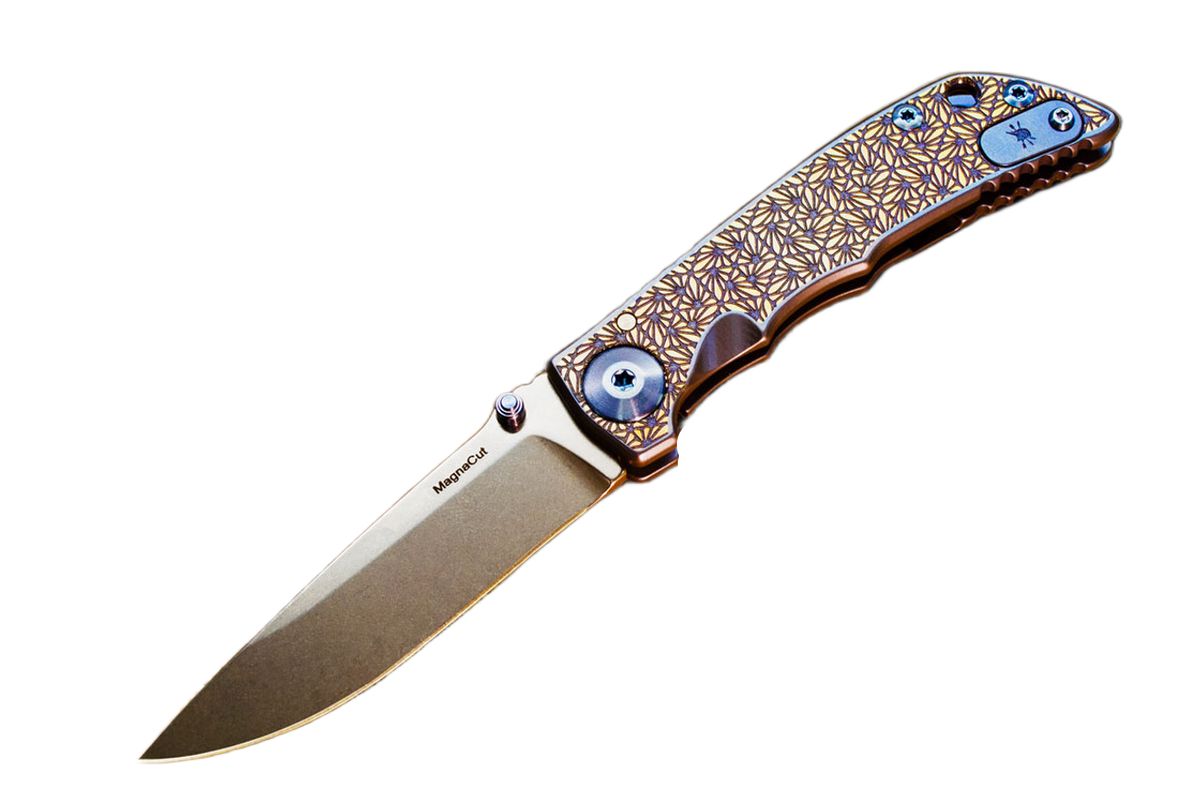 CPM MagnaCut – proszkowa stal nierdzewna wytwarzana w procesie Crucible® Particle Metallurgy (CPM) utwardzana w przedziale 60.5-62.5 HRC. Duża zawartość wanadu 4.0% (V), molibdenu 2.0% (Mo) i niobu 2.0% (Nb) gwarantuje dokładność i czystość nieporównywalną z bardziej „konwencjonalnymi” stalami. Zaprojektowana i opracowana specjalnie do produkcji ostrzy przez Larrina Thomasa, spełnia wszystkie wymagania miłośników noży. Dzięki CPM MagnaCut udało się stworzyć stal która, jak żadna inna łączy wyjątkowe właściwości stali nożowych. Rezultatem jest materiał ostrza, który oferuje niezwykłą równowagę między odpornością na zużycie, wytrzymałością i odpornością na korozję. Obecnie na rynku światowym nie ma innej stali, która oferuje porównywalną kombinację doskonałych właściwości. Ta wyjątkowa stal wytwarzana jest w amerykańskich hutach Crucible® Industries.
