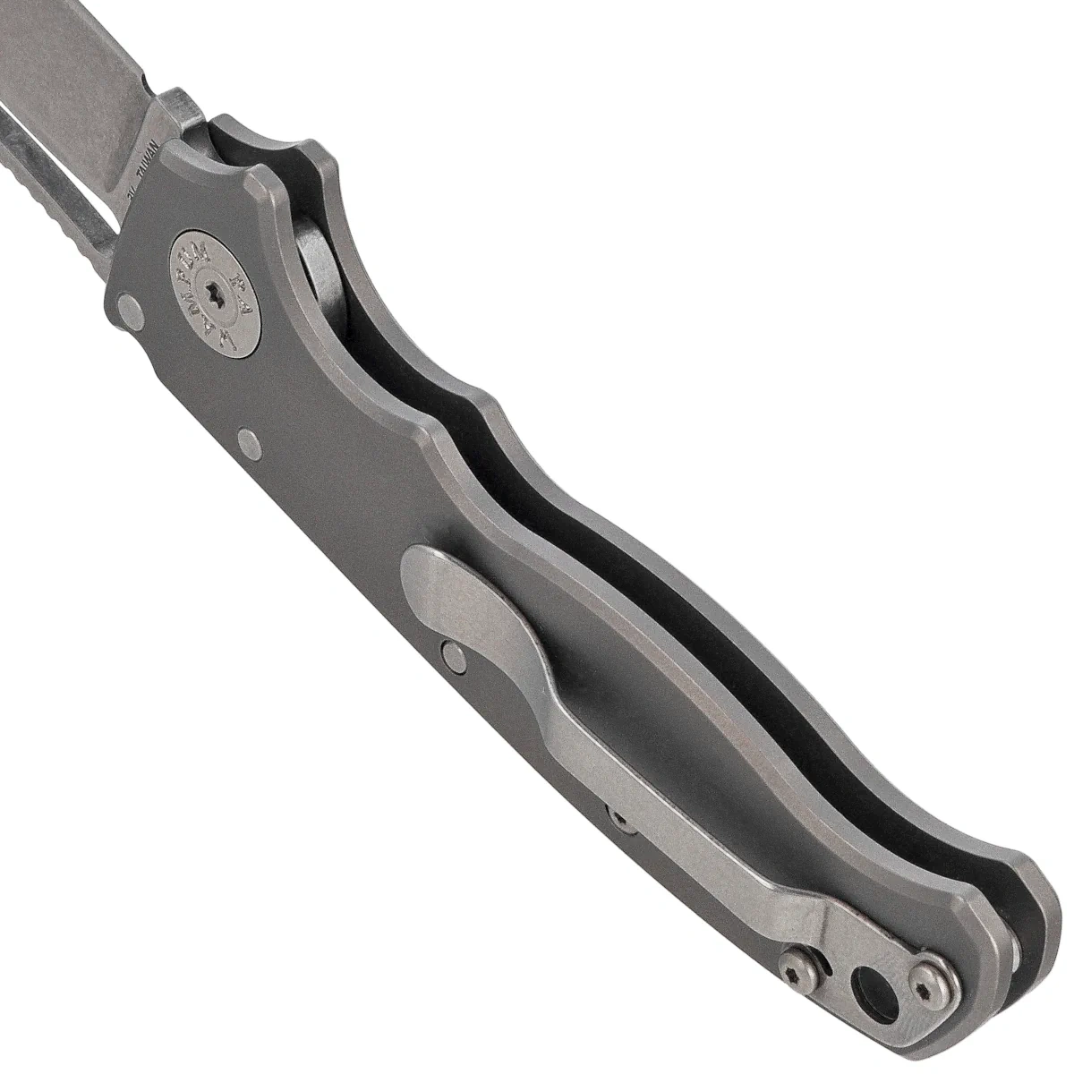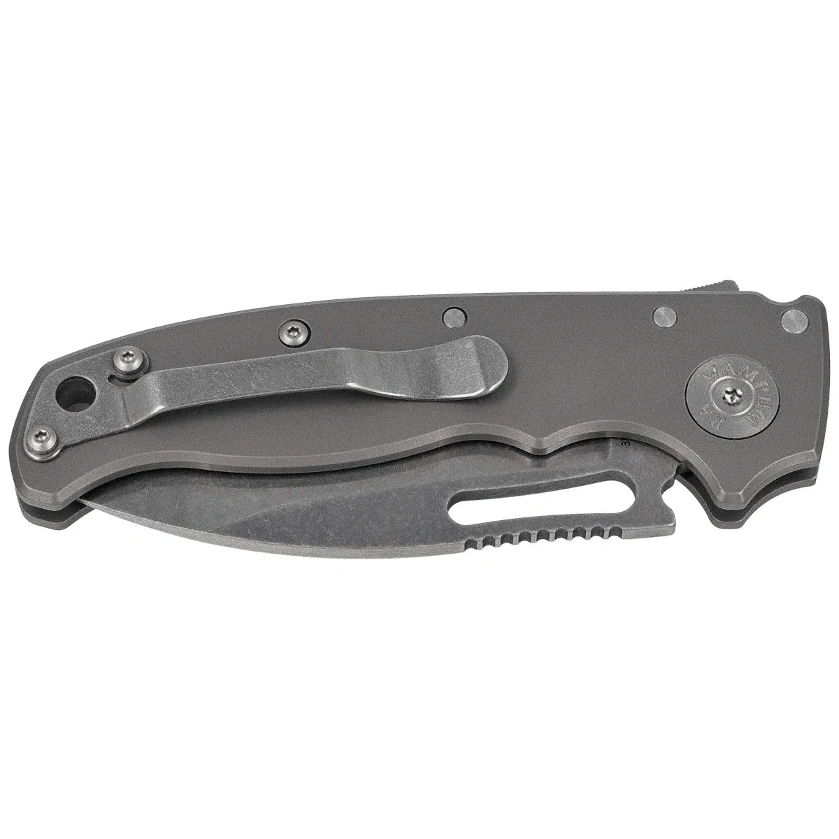 Rękojeść - okładziny z tytanu, wyróżniające się lekkością, sztywnością i odpornością na warunki zewnętrzne. Profilowane podcięcia wspierają pewny chwyt, także w rękawicach. Stalowe tuleje dystansowe zwiększają sztywność całej konstrukcji, a klips deep carry umożliwia wygodne i dyskretne przenoszenie w kieszeni. Dodatkowo w zestawie klips na lewą stronę, dla osób leworęcznych. Elementy montażowe w systemie Torx upraszczają demontaż i serwisowanie noża. Shark-Lock™, umieszczony w górnej części rękojeści, działa błyskawicznie, zapewniając pełną kontrolę i bezpieczeństwo, niezależnie od preferowanego chwytu czy dominującej ręki.