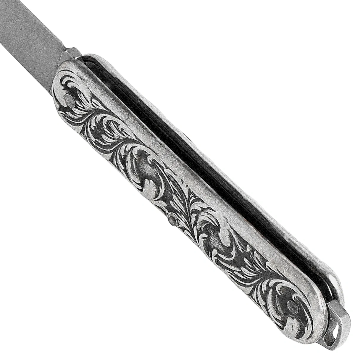 Rękojeść - okładziny Wykonane z misternie grawerowanego srebra próby 925. Prosty kształt świetnie dopasowuje się do każdej dłoni. W tylnej części kółko do przewleczenia linki asekuracyjnej lub ozdobnej.