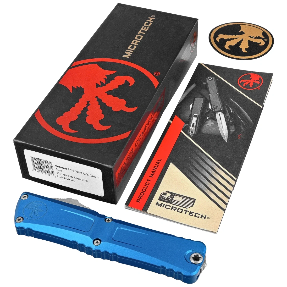 Combat Troodon Gen III S/E Blue Aluminium, Stonewashed ten największy z noży automatycznych, to szczyt precyzyjnej inżynierii i taktycznej sprawności w dziedzinie noży OTF (Out The Front). Zbudowany z myślą o szerokim spektrum zastosowań użytkowych, może pochwalić się większym o 25% rozmiarem w porównaniu do flagowego Troodona. Precyzyjnie wykonany, wyposażony w wyrafinowany i piekielnie szybki mechanizm wysuwający ostre jak brzytwa ostrze. W 100% wyprodukowany i zmontowany w USA. Projekt Anthony'ego Marfione, knifemakera i właściciela Microtech Knives.