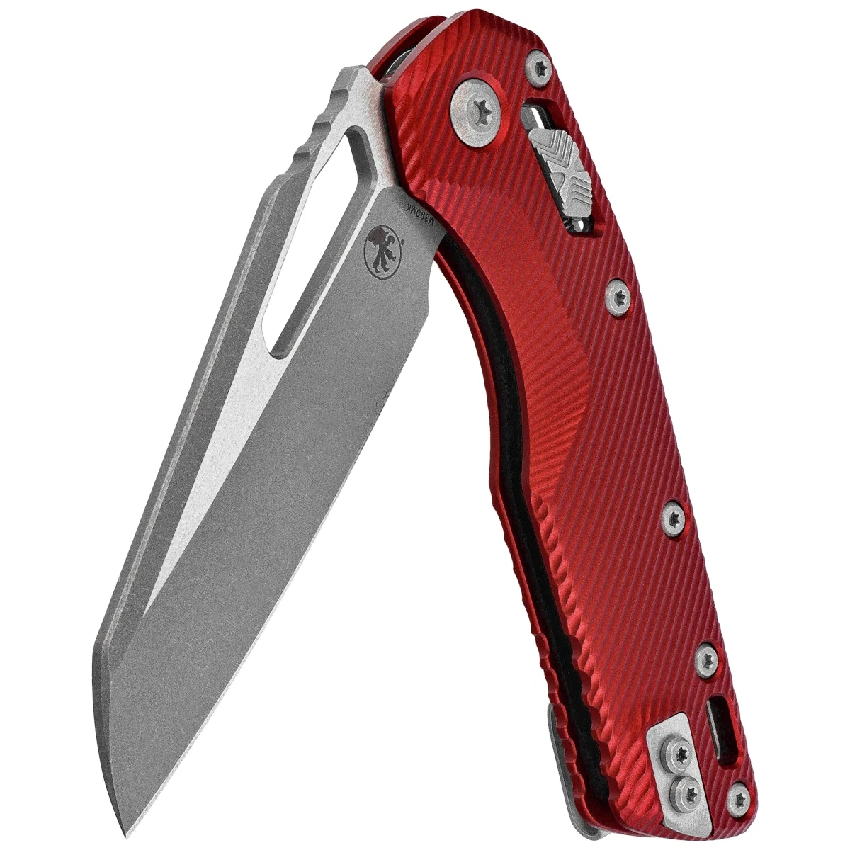 Rękojeść - wykonana z doskonałą precyzją w technologii 3D na frezarkach CNC z anodyzowanego aluminium 6061-T6, dla lepszego uchwytu pokryta wyfrezowanymi liniami (Fluted). Szeroki suwak blokady z charakterystyczną dla firmy Microtech schodkową strukturą X. Obie okładziny zostały skręcone przy pomocy solidnego, aluminiowego backspacera. Dwustronny (prawa / lewa) klips pozwala dyskretnie nosić nóż w pozycji tip-up. Nad klipsem lanyard hole, miejsce na linkę zabezpieczającą lub ozdobną.
