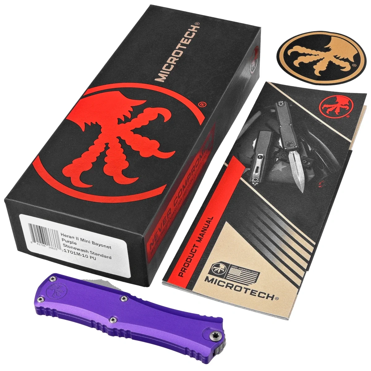 Hera II Mini Bayonet Purple Aluminium, Stonewashed kompaktowa wersja jednego z najlepszych i wszechstronnych noży automatycznych OTF (Out The Front) wyposażona w ostrze typu Bayonet. Wzorowany na kultowym automacie Troodon, stanowi ogniwo pośrednie pomiędzy modelami EDC a konstrukcjami typowo taktycznymi. Automat o ponadprzeciętnej wytrzymałości działa w trybie D/A (Double Action) zapewniając błyskawiczne, mocne i pewne otwieranie oraz zamykanie ostrza. Model wyróżnia się doskonałym spasowaniem elementów i najwyższej jakości wykończeniem. Projekt autorstwa Anthony'ego Marfione, uznanego knifemakera i właściciela Microtech Knives.