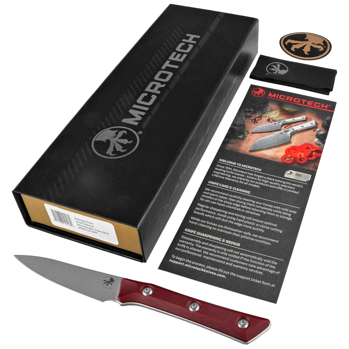 Głownia - typu pairing została wykonana z innowacyjnej stali M390MK, cechującej się ponadprzeciętną twardością, wysoką odpornością na zużycie oraz pełną ochroną przed korozją – nawet w środowisku kuchennym. Szlif płaski zapewnia precyzyjne prowadzenie ostrza przy powierzchni i gładką linię cięcia, co przekłada się na wysoką skuteczność przy obieraniu, czyszczeniu czy formowaniu. Zastosowane wykończenie stonewashed nie tylko chroni powierzchnię klingi przed mikrorysami, ale również nadaje jej techniczny, profesjonalny wygląd, który doskonale wpisuje się w charakter marki Microtech.