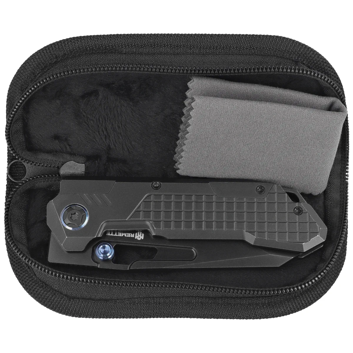 Rękojeść - wykonana z tytanu, integralny element konstrukcji noża, odpowiadający za jego sztywność, trwałość oraz pewność chwytu. Wyraźnie zaznaczone krawędzie, frezowane płaszczyzny i regularna tekstura powierzchni poprawiają kontakt dłoni z rękojeścią oraz ograniczają poślizg, nawet przy dynamicznych ruchach i długotrwałym użytkowaniu. Profil uchwytu sprzyja naturalnemu ułożeniu dłoni, zapewniając stabilność zarówno przy pracy precyzyjnej, jak i przy cięciach wymagających większego nacisku. Konstrukcja zachowuje spójny balans pomiędzy masą a kontrolą, co pozytywnie wpływa na manewrowość noża w codziennym użytkowaniu. Zastosowany klips z tytanu umożliwia wygodne, dyskretne przenoszenie i nie zakłóca ergonomii chwytu. Całość tworzy rękojeść o jednoznacznie technicznym charakterze, zaprojektowaną z myślą o trwałości, niezawodności i komforcie długotrwałej pracy.