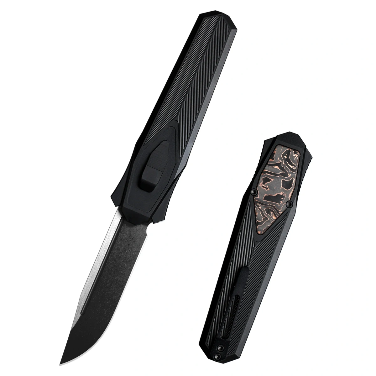 Rękojeść - wykonana na frezarkach CNC z aluminium, z trójwymiarową teksturą. Fazowane krawędzie okładek eliminują ostre ranty, a perfekcyjnie dopasowana wkładka (inlay) z kompozytu Copper Carbon Fiber nadają ekskluzywnego charakteru oraz poprawiają pewność uchwytu. Po prawej stronie kunsztowny suwak do wysuwania/wsuwania klingi. Jednopozycyjny tytanowy (prawa) klips deep carry umożliwia dyskretne przenoszenie noża w kieszeni w pozycji tip-down (czubkiem ostrza do dołu).