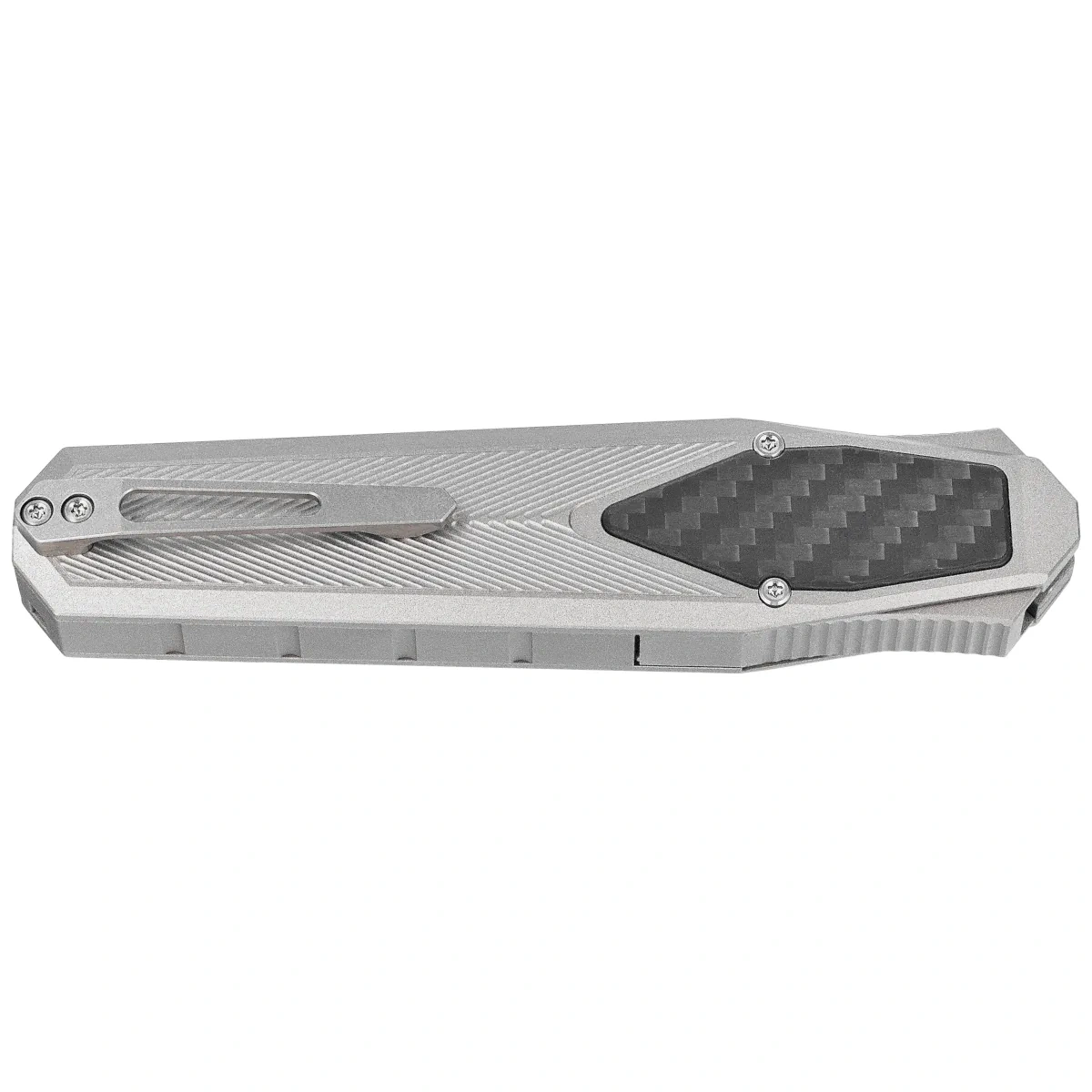 Rękojeść - wykonana na frezarkach CNC z aluminium, z trójwymiarową teksturą. Fazowane krawędzie okładek eliminują ostre ranty, a perfekcyjnie dopasowana wkładka (inlay) z kompozytu Carbon Fiber nadają ekskluzywnego charakteru oraz poprawiają pewność uchwytu. Po prawej stronie kunsztowny suwak do wysuwania/wsuwania klingi. Jednopozycyjny tytanowy (prawa) klips deep carry umożliwia dyskretne przenoszenie noża w kieszeni w pozycji tip-down (czubkiem ostrza do dołu).