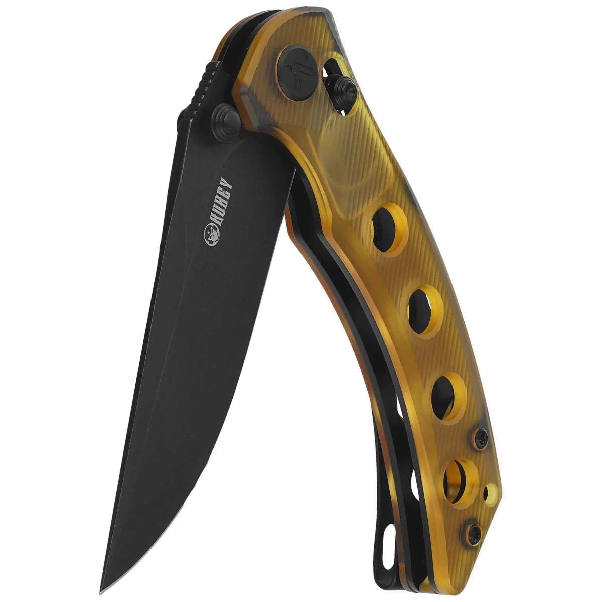 Rękojeść - to dwa kawałki kompozytu Ultem™, materiału niezwykle wytrzymałego mechanicznie i praktycznie całkowicie odpornego na warunki atmosferyczne i działanie chemikaliów, teksturowane dla poprawienia pewności uchwytu, przykręcono do stalowej ramy noża. Fazowane krawędzie okładek eliminują ostre ranty dla wygody i poprawiają pewność uchwytu. Serio otworów w rękojeści dodaje wizualnej lekkości i odciąża nóż. Masywny backspacer zapewnia pożądaną sztywność i wytrzymałość projektu Prosta, pewna konstrukcja daje pewność wieloletniego użytkowania. Głębokie podcięcie na palec (fore finger groove) poprawia pewność uchwytu. Oś pivota zdobi stylizowane logo marki Kubey Knife. Dwupozycyjny (prawa.lewa) klips deep carry pozwala przenosić dyskretnie nóż w kieszeni w pozycji tip-up (czubkiem ostrza do góry).