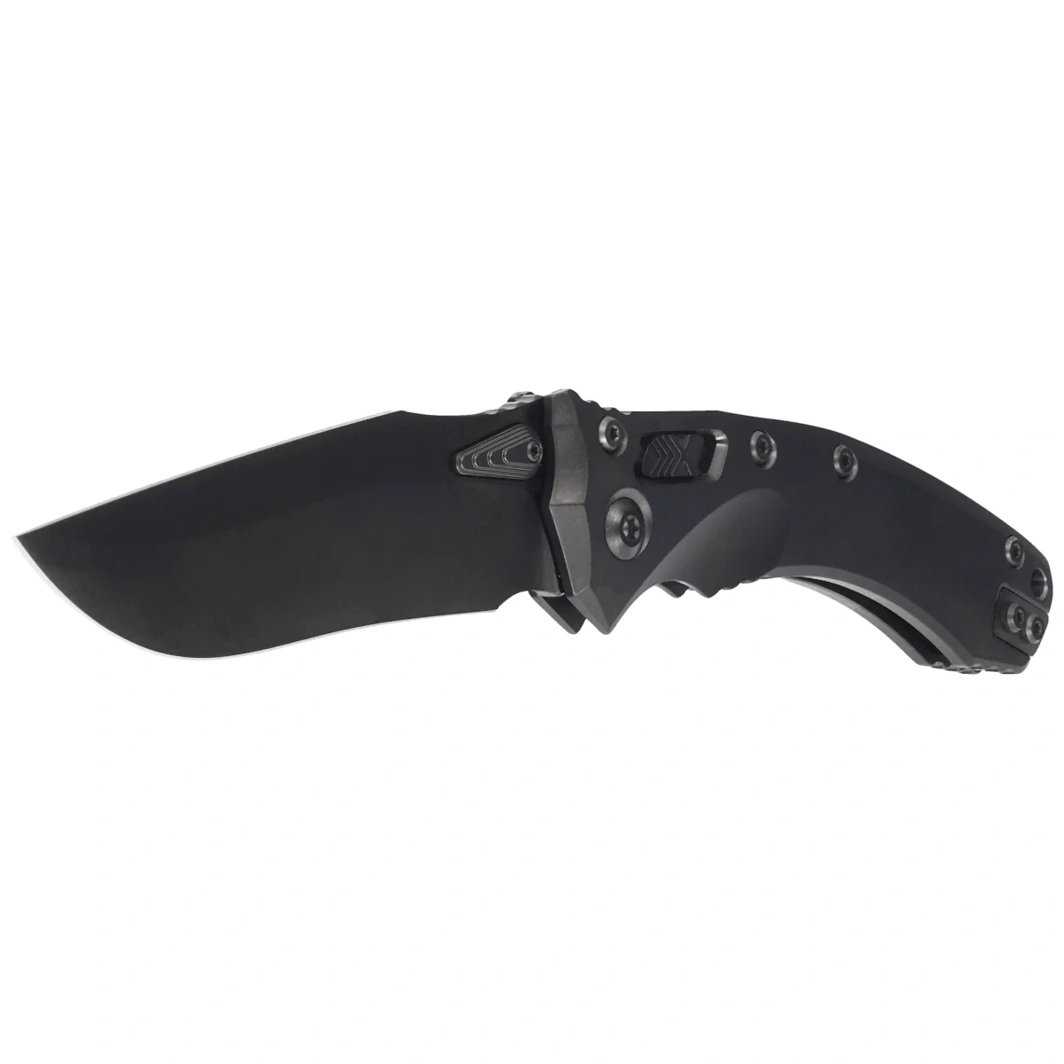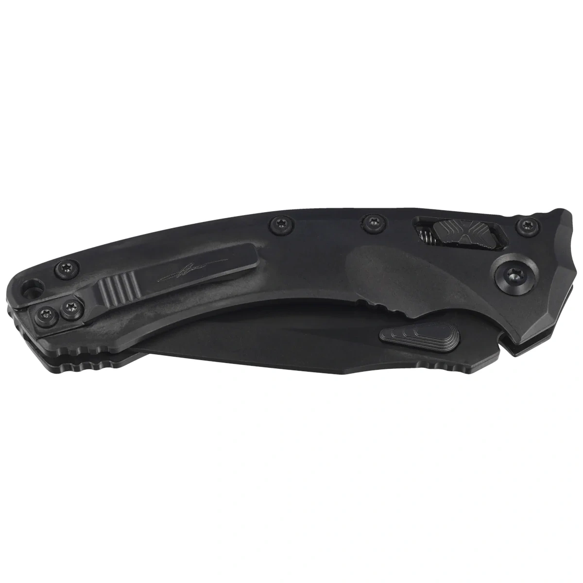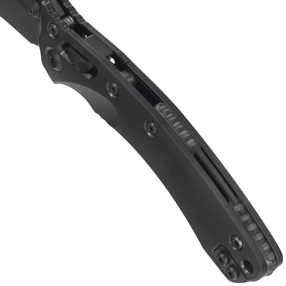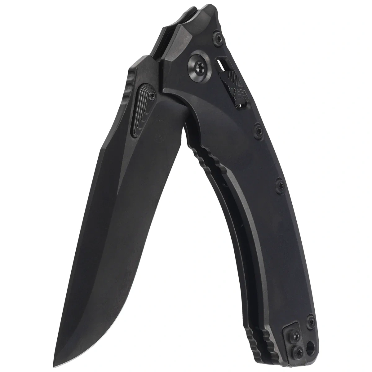 Głownia - szlifowana maszynowo typu Drop Point, jednostronnie ostrzona S/E (Single Edge). Wykończona maskującą drobne rysy powstałe podczas użytkowania metodą Stonewashed a następnie pokryta powłoką DLC. Otwierana za pomocą charakterystycznego dla tego modelu obustronnego, moletowanego kołka w klindze (dual thumb stud) w kształcie łzy, dzięki czemu mogą z niego bez problemu korzystać osoby prawo i leworęczne. Za gładką pracę mechanizmu otwierającego odpowiadają łożyska kulkowe. Ostrze wyprowadzono wysokim szlifem płaskim (Flat Grind), dającym doskonałą geometrię krawędzi tnącej oraz ekstremalną wydajność cięcia. Aby zachować pełną kontrolę nad ostrzem na grzbiecie klingi wykonano upper jimping, karbowane oparcie pod kciuk. Całość blokowana jest wygodną blokadą Ram-Lock.